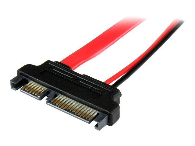 Connect a Slimline SATA optical drive up to 6in away from a standard SATA motherboard connection. The SLSATAADAP6 Slimline SATA to SATA adapter features a Slimline Serial ATA connector on one end and a standard SATA data connector (with SATA power connector) on the other, enabling you to connect a Slimline SATA optical drive to standard motherboard and power supply connections.
