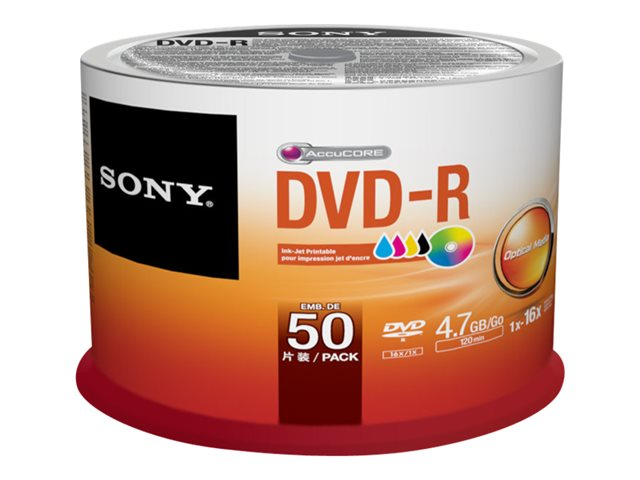 Bläckstråleskrivbar DVD-R med 16x-hastighet, levereras i 50-pack spindelbox. Sony 50DMR47PP är idealisk för att personifiera och få professionellt utseende media för enkel arkivering, tematisering och nöje. Perfekt för musik- och filmsamlingar, företagspresentationer, demoskivor och duplicering!