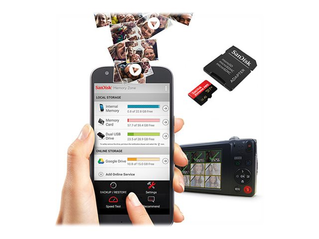 Get extreme speeds for fast transfer, app performance, and 4K UHD. Ideal for your Android smartphone, action cameras or drones, this high-performance microSD card does 4K UHD video recording, Full HD video, and high-resolution photos. The super-fast SanDisk Extreme PRO microSDXC memory card reads up to 170 MB/s and writes up to 90 MB/s. Plus, it's A2-rated, so you can get fast application performance for an exceptional smartphone experience.