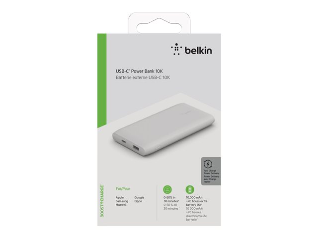 Belkin BoostCharge - Strömförsörjningsbank - 10000 mAh - 18 Watt - Fast Charge, PD - 2 utdatakontakter (USB, 24 pin USB-C) - vit