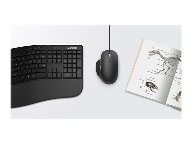 Microsoft Ergonomic Mouse minskar risken för överbelastning och ger överlägsen kontroll med ultrajämn spårning på olika typer av ytor, optimerat rullningshjul för exakt navigering på webben och i dokument samt två programmerbara knappar.