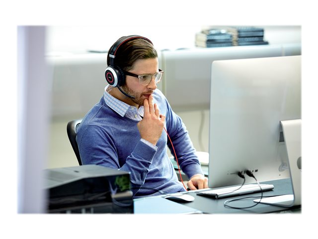 Evolve 80 bärs över örat och har överlägsen aktiv och passiv bullerdämpning. En inbyggd upptagetindikator skyddar dig mot störningsmoment och förbättrar produktiviteten. Du kan även lyssna på musik med kristallklar tydlighet.