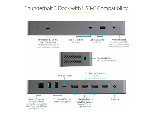 StarTech.com Thunderbolt 3-dockningsstation med USB-C värdkompabilitet - Dubbla 4K 60Hz DisplayPort 1.4- eller dubbla HDMI-skärmar - Singel 8K - TB3/USB-C dockningsstation för bärbar dator - 96 W PD, 5xUSB - 10 Gbit/s - dockningsstation - USB-C 3.2 Gen 2 / Thunderbolt 3 - 2 x HDMI, 2 x DP - 1GbE