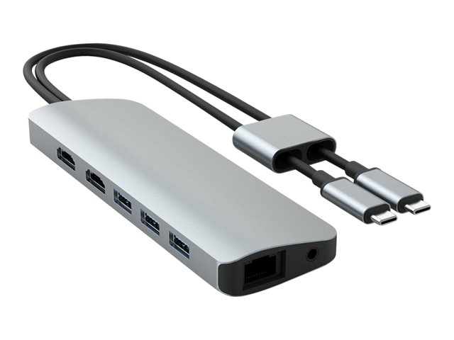 Turns two USB-C ports into 10 ports with 2 x 4K 60Hz HDMI, 3 x USB-A, Gigabit Ethernet, MicroSD/SD, 60W USB-C power delivery, and a 3.5mm audio jack.